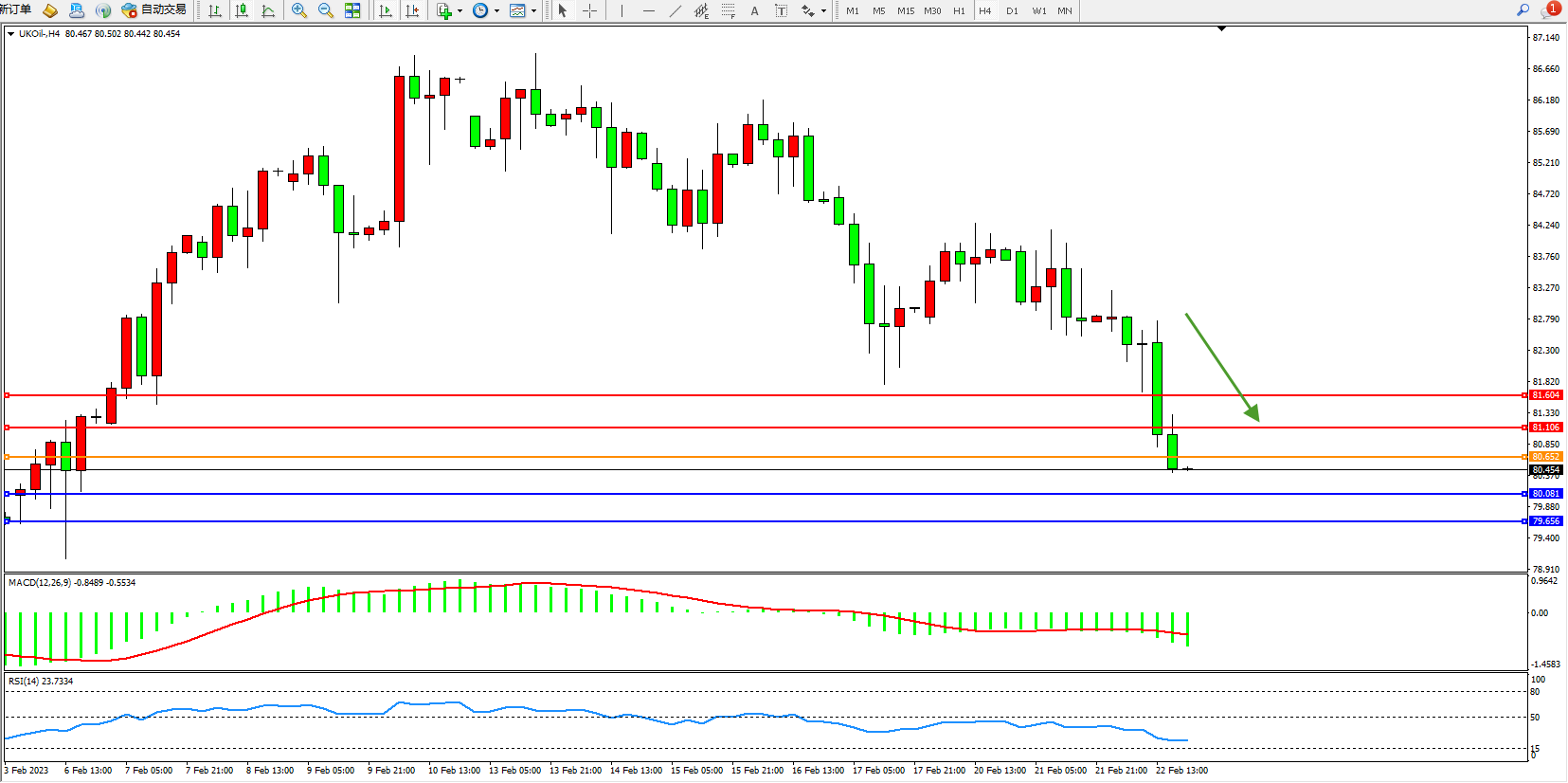 4小时图看:市场空头情绪笼罩,短期跌势或将延续,且未见有止步迹象,MACD指标处于空头区域缓慢下行,RSI指标处于空头区域维持震荡下移;