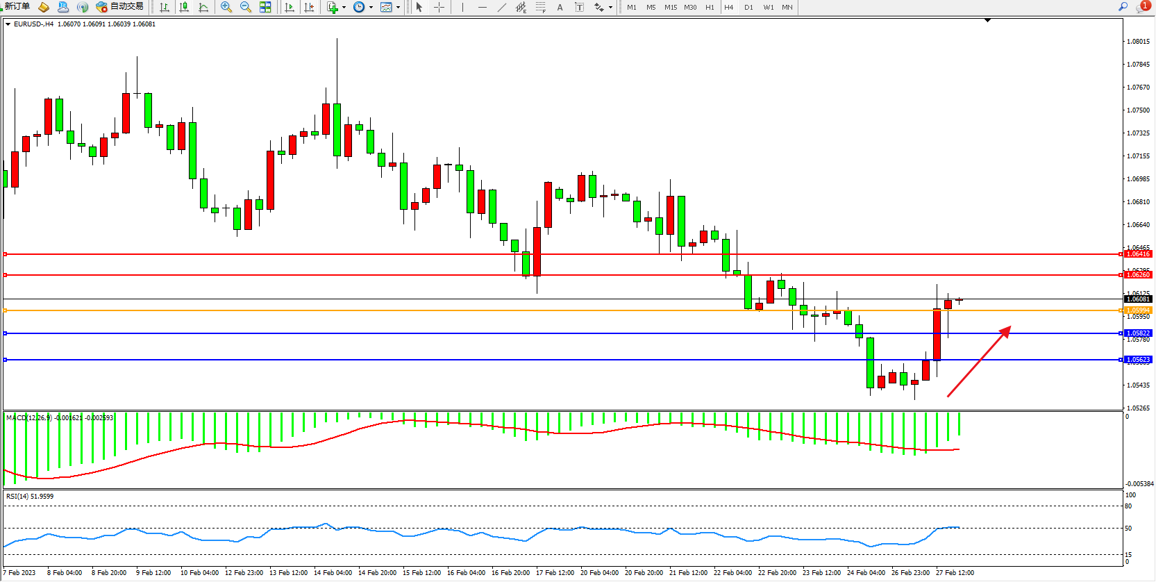 交易策略:1.05994上方看涨,目标1.06260、1.06416