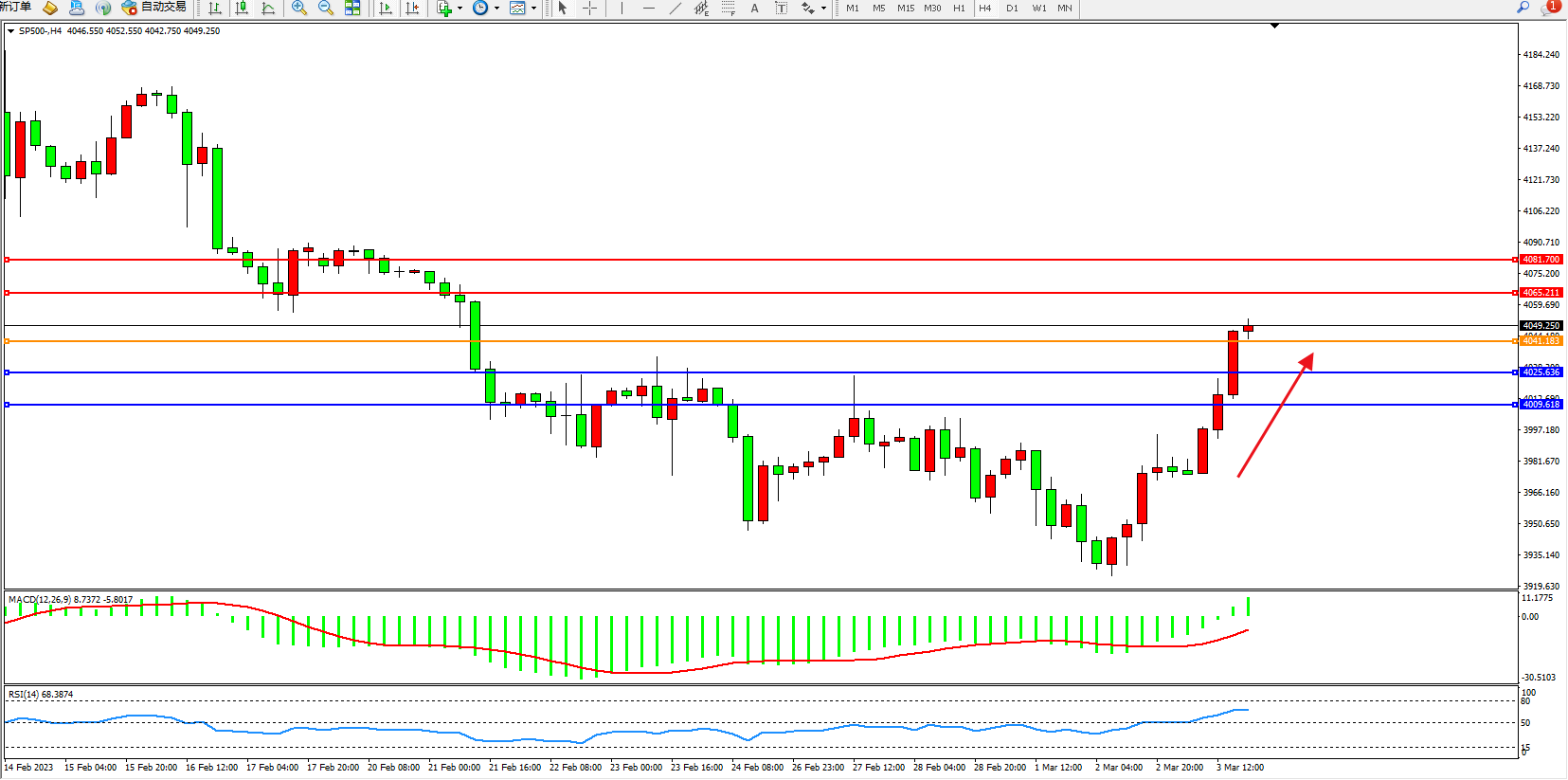 标普500指数3月3日(周五)收盘上涨64.80点,涨幅1.63%,报4046.15点;美国股指期货上涨,因美国国债收益率在长达一周的涨势中稍微走软,美国10年期国债收益率下跌,前一交易日触及四个月高点,但仍维持在4%上方。