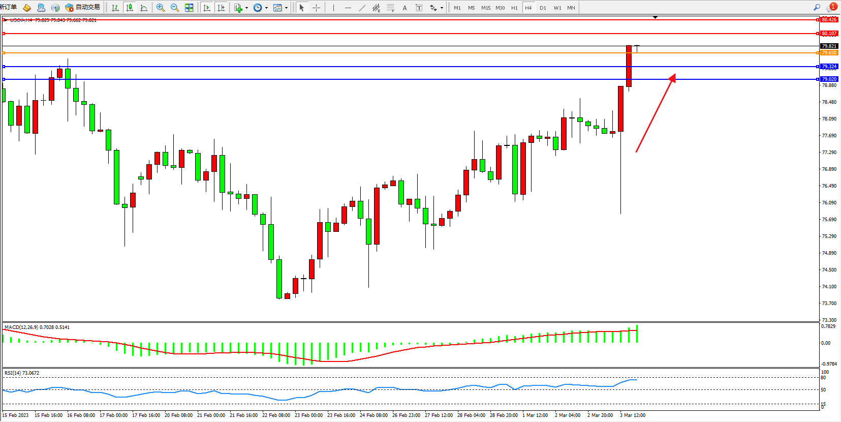 4小时图看:多头动力强势攀升,短期多头不断向上移动,市场多头情绪涌现,MACD指标处于多头区域持续上行,RSI指标处于多头区域维持上移;