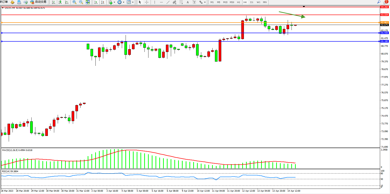 4小时图看:高位短期窄幅整理,空头动力有伺机入场迹象,但依旧处于高位震荡走势中,MACD指标处于多头区域维持整理平移,RSI指标处于50均衡线上側徘徊;