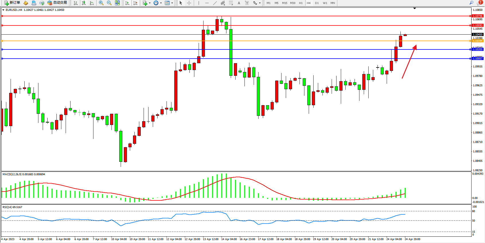欧元美元EURUSD—4小时K线图显示: