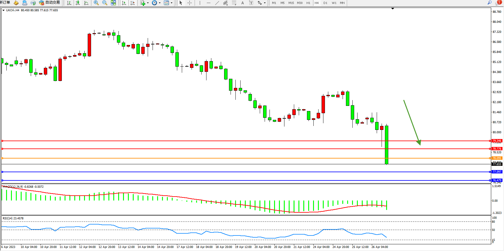 交易策略:78.095下方看跌,目标77.097 76.479
