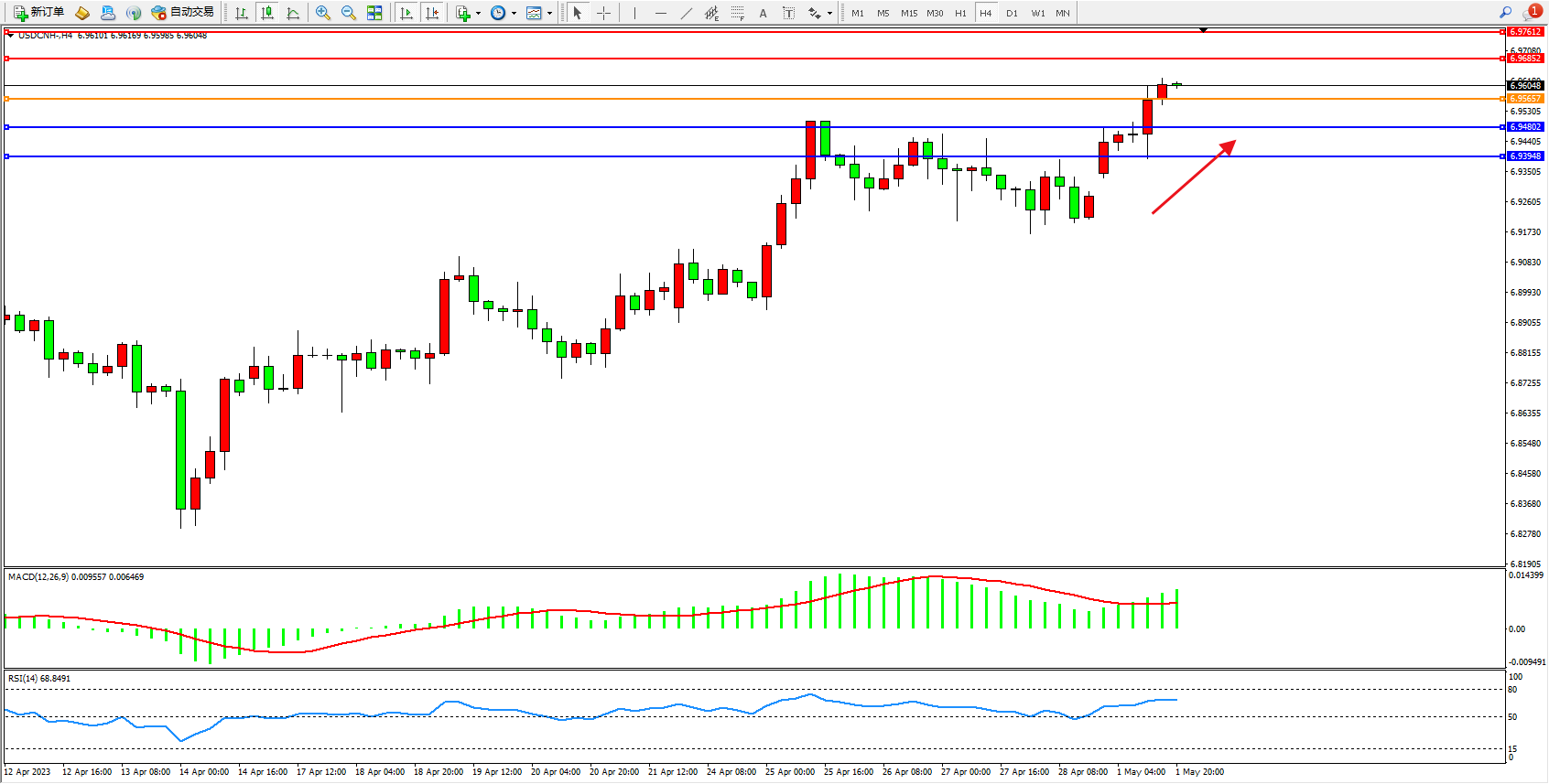 交易策略:6.95657上方看涨,目标6.96852 6.97612