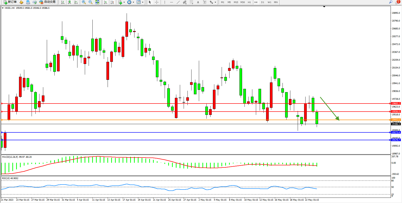 香港恒生指数5月23日(周二)收盘下跌246.92点,跌幅1.25%,报19431.25点;港股高开低走,三大指数午后跌幅进一步加大,市场情绪表现低迷。恒指最终下跌1.25%,国指、恒生科技指数分别下跌1.35%和1.31%。昨日领涨大市的科技股普遍齐挫,大金融股(银行、保险、券商)等热门股纷纷下跌。南下资金全日净流入58.75亿港元,大市成交额为863亿港元。
