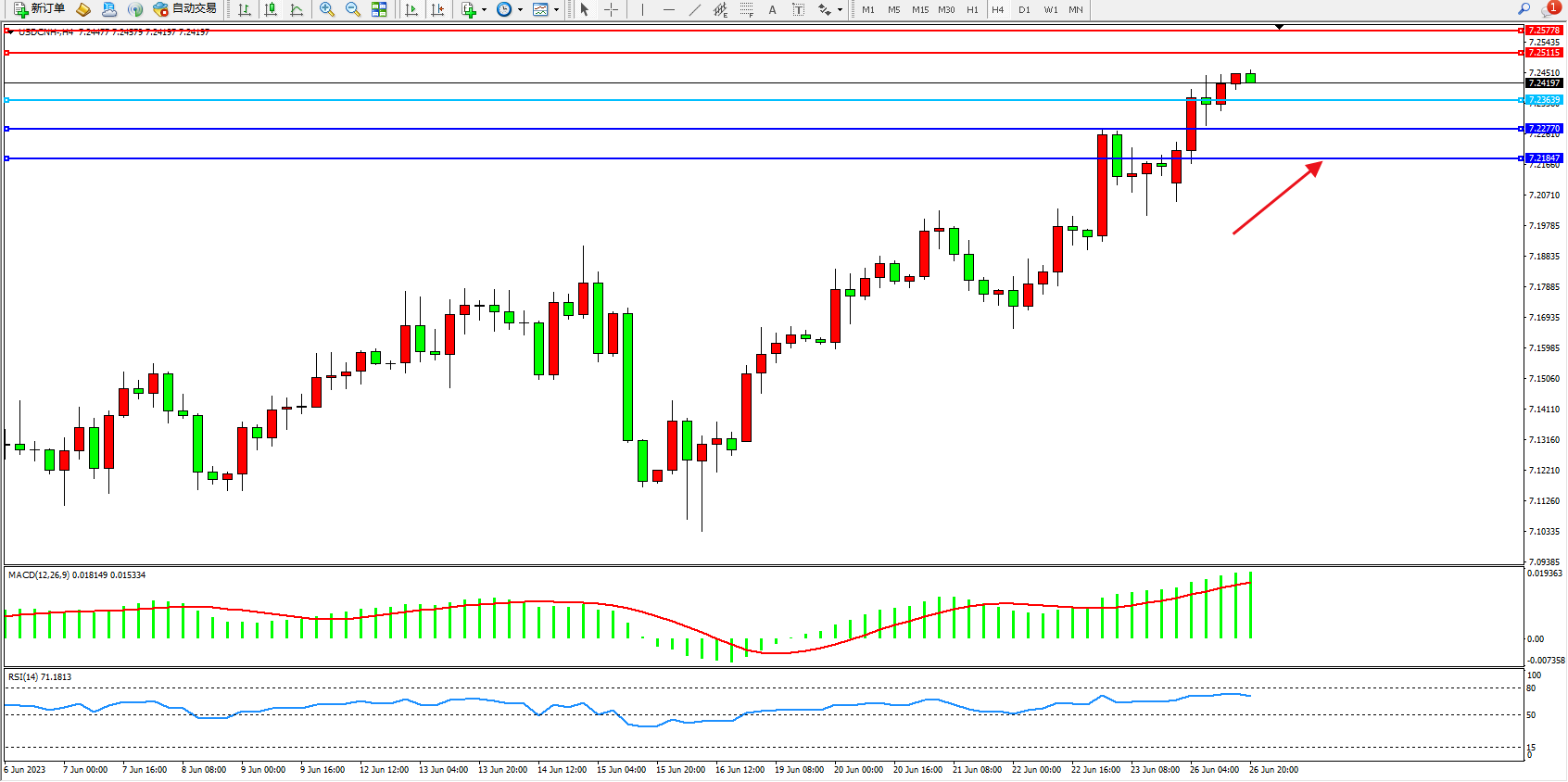 交易策略:7.23639上方看涨,目标7.25115  7.25778