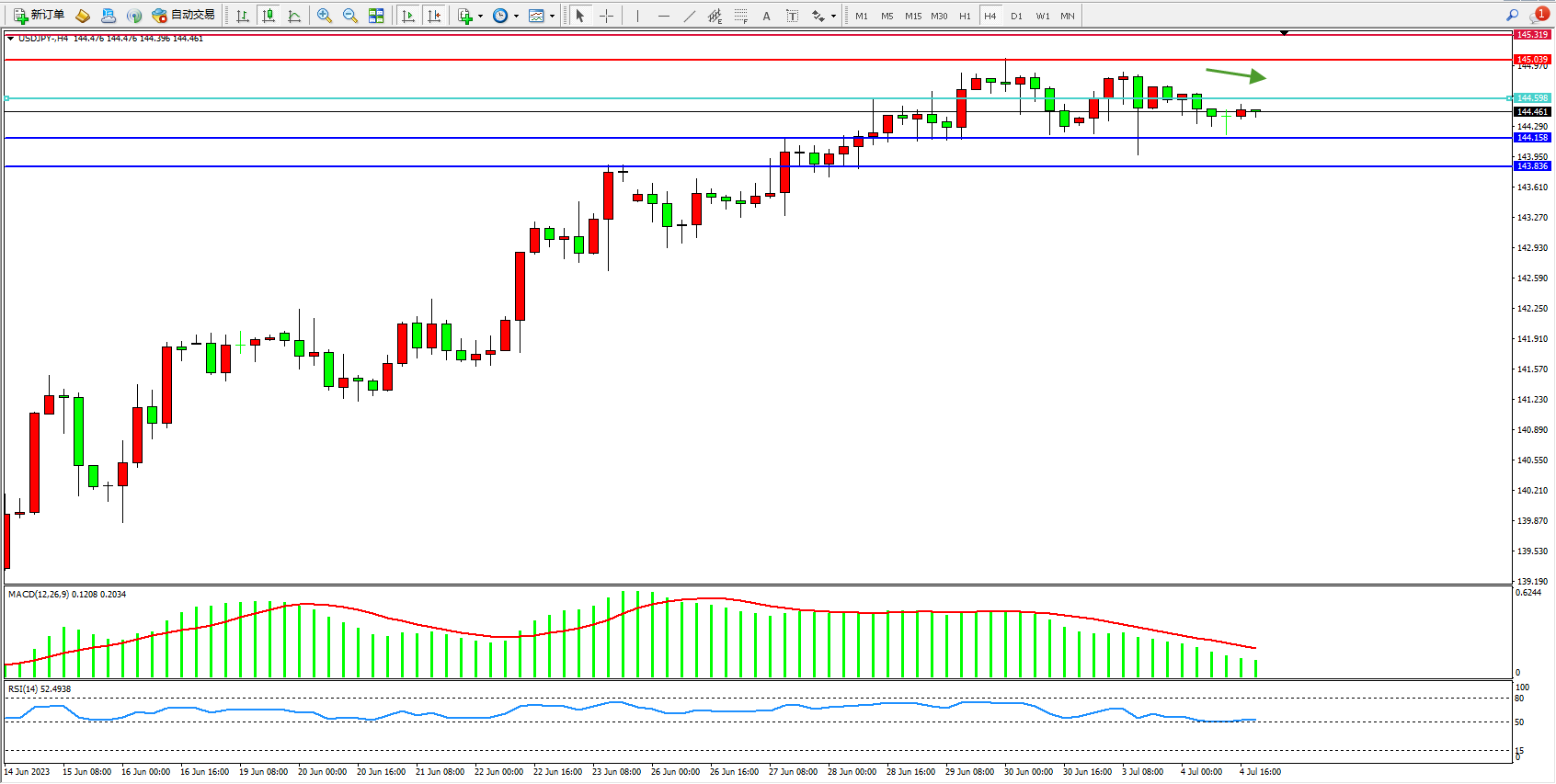 美元兑日圆维持144.461附近震荡,市场预计日本当局将有干预行动,日本在去年9月买入了日元,这是日本自1998年以来首次进入市场提振其货币,此前日本央行决定维持超宽松政策,使美元兑日元升至145。