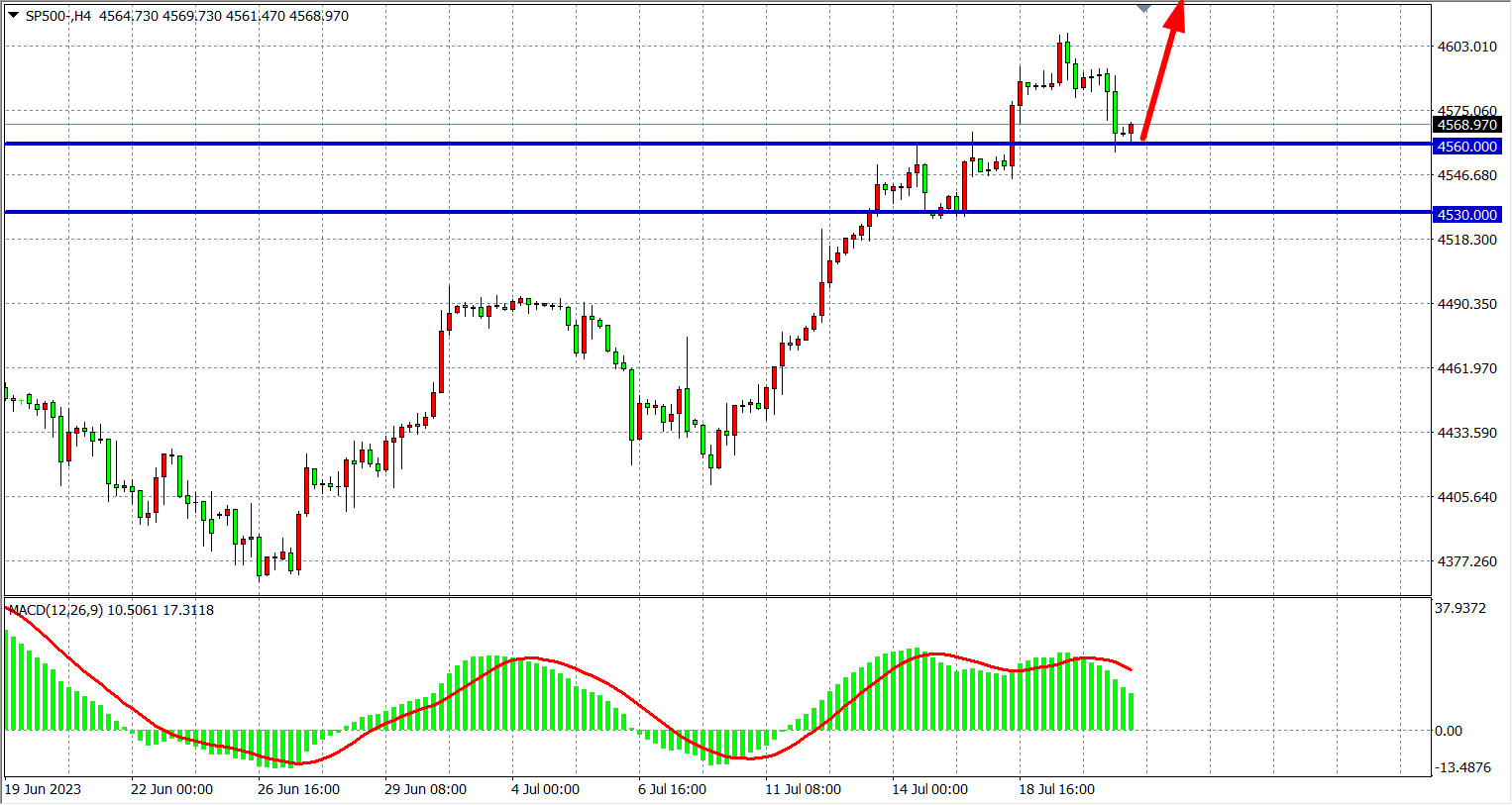 4小时图看,标普高位受阻,MACD量能在零轴上有所缩量,回调开启但尚未改变上行趋势,支撑关注4530-4560附近,上方阻力4600-4640。