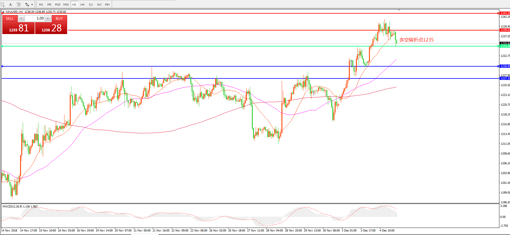 小时图看,黄金突破前期阻力后连续上行,形成明显的多头形态,MACD绿柱减少,红柱增加,操作上依然以逢低做多为主。