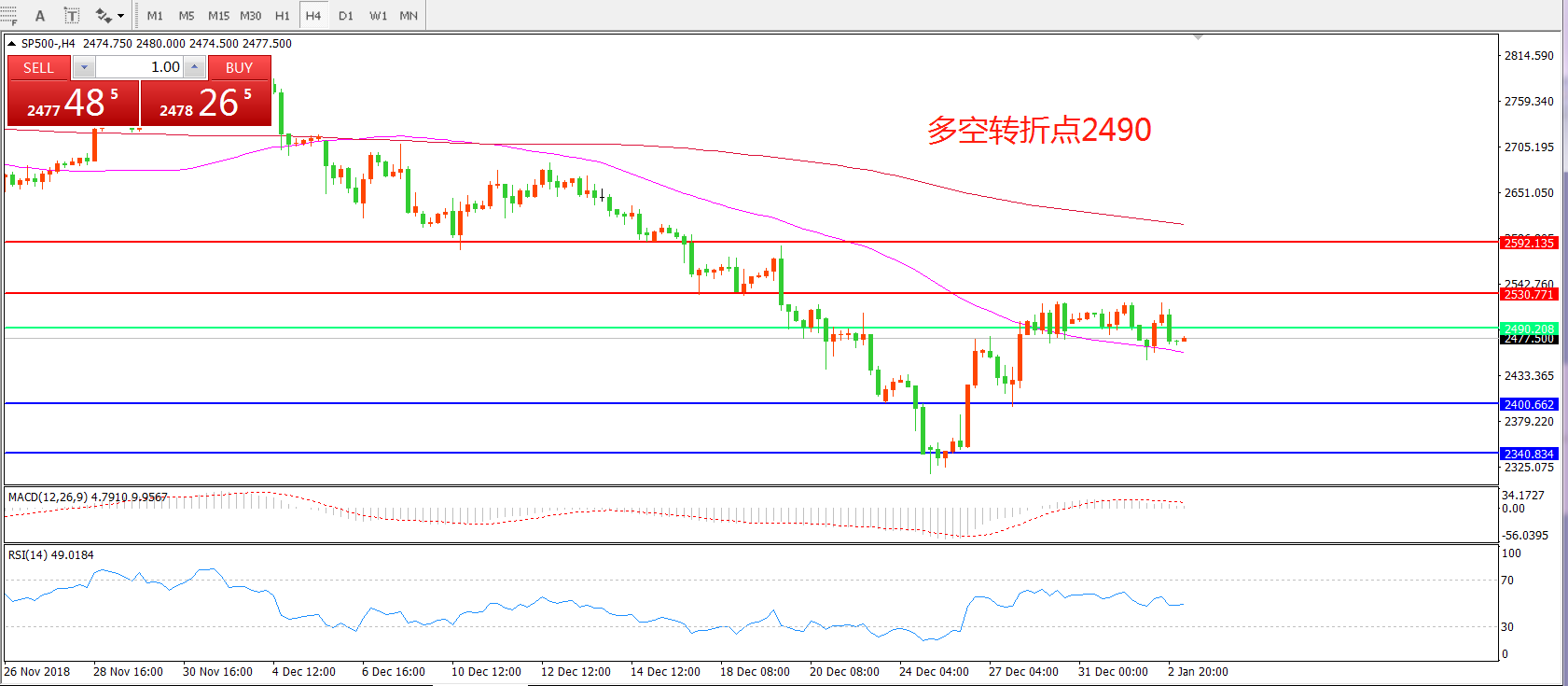 4小时图看,SP500站稳55均线后呈现整理走势,MACD绿柱缩短,RSI指标出现拐头,短期小幅反弹概率较大。