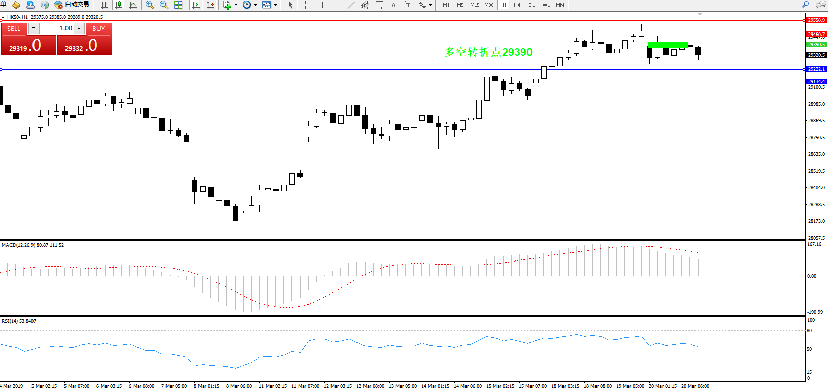 香港恒生指数收盘跌0.5%至29320.97点,权重蓝筹股业绩前后的炒作暂时是最大的助力,另外A股以及美股走势仍是高位震荡向上,亦助恒指升情未完。板块方面,软件、产业信托及内房股似有接力炒作的现象,可留意相关股份公布业绩前后股价表现。美联储利率决议按兵不动,下调利率“点阵图”、下修经济增长与通胀预期,宣布将逐步停止“缩表”,政策鸽派程度高于预期。