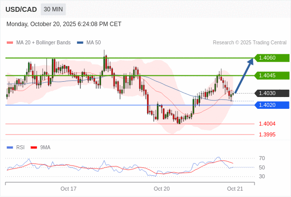 在 1.4020 之上,看涨,目标价位为 1.4045 ,然后为 1.4060 。