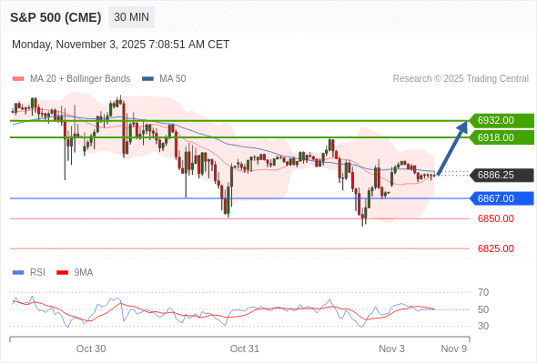 交易策略: 在 6867.00 之上,看涨,目标价位为 6918.00 ,然后为 6932.00 。