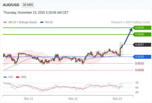在 0.6530 之上,看涨,目标价位为 0.6580 ,然后为 0.6595 。
