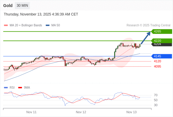 在 4145 之上,看涨,目标价位为 4220 ,然后为 4265 。