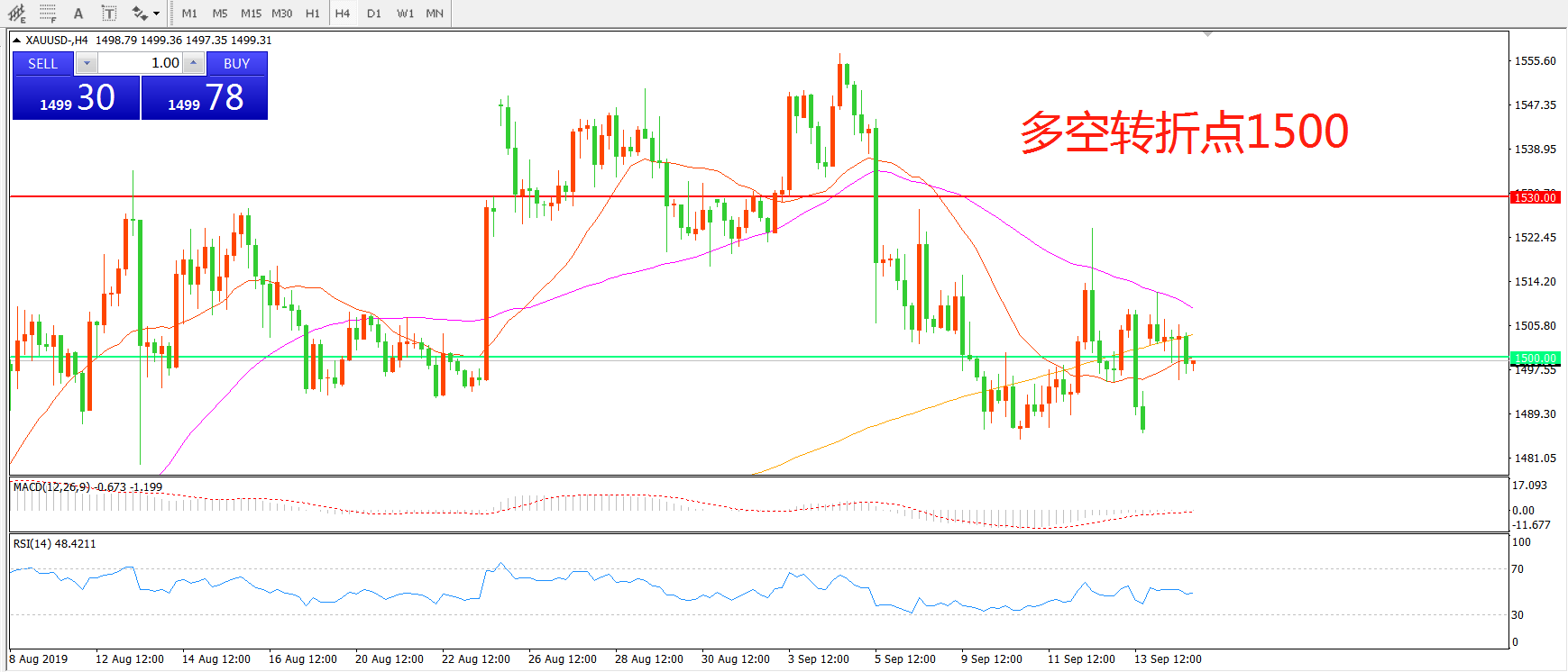 周六沙特最大原油设施遭无人机袭击,导致逾500万桶/日产能暂停,受影响的产油量占沙特当前产油量的一半,供应危机和中东地区可能会陷入战争的担忧引爆了市场中的避险情绪,金价冲高后震荡回落,最终收报1498.51美元/盎司。中东地缘局势紧张、全球经济增长放缓的忧虑支撑金价,但在本周美联储等诸多央行决议之前,投资者情绪依然保持谨慎。