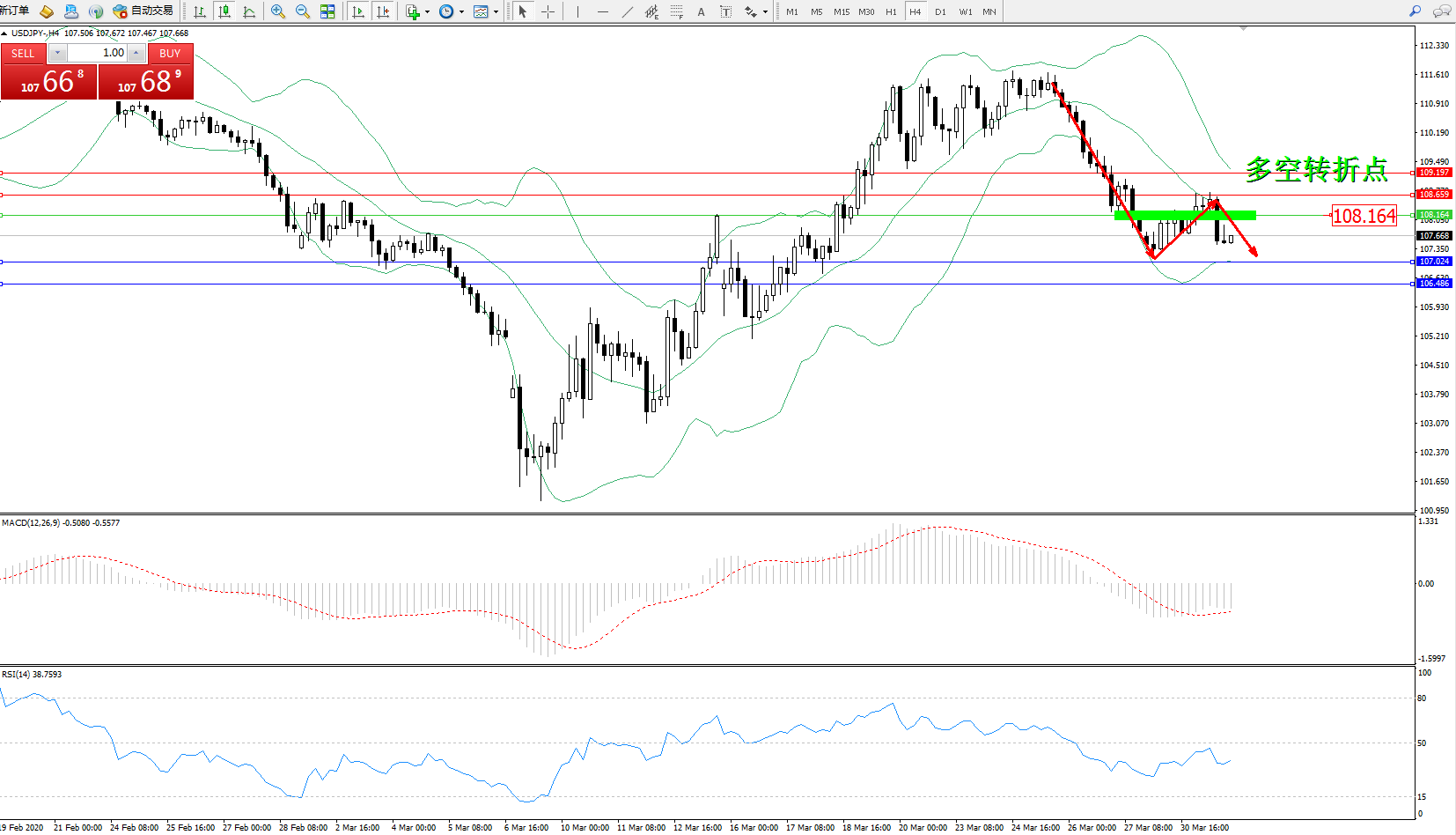 美元日元USDJPY——4小时K线图显示: