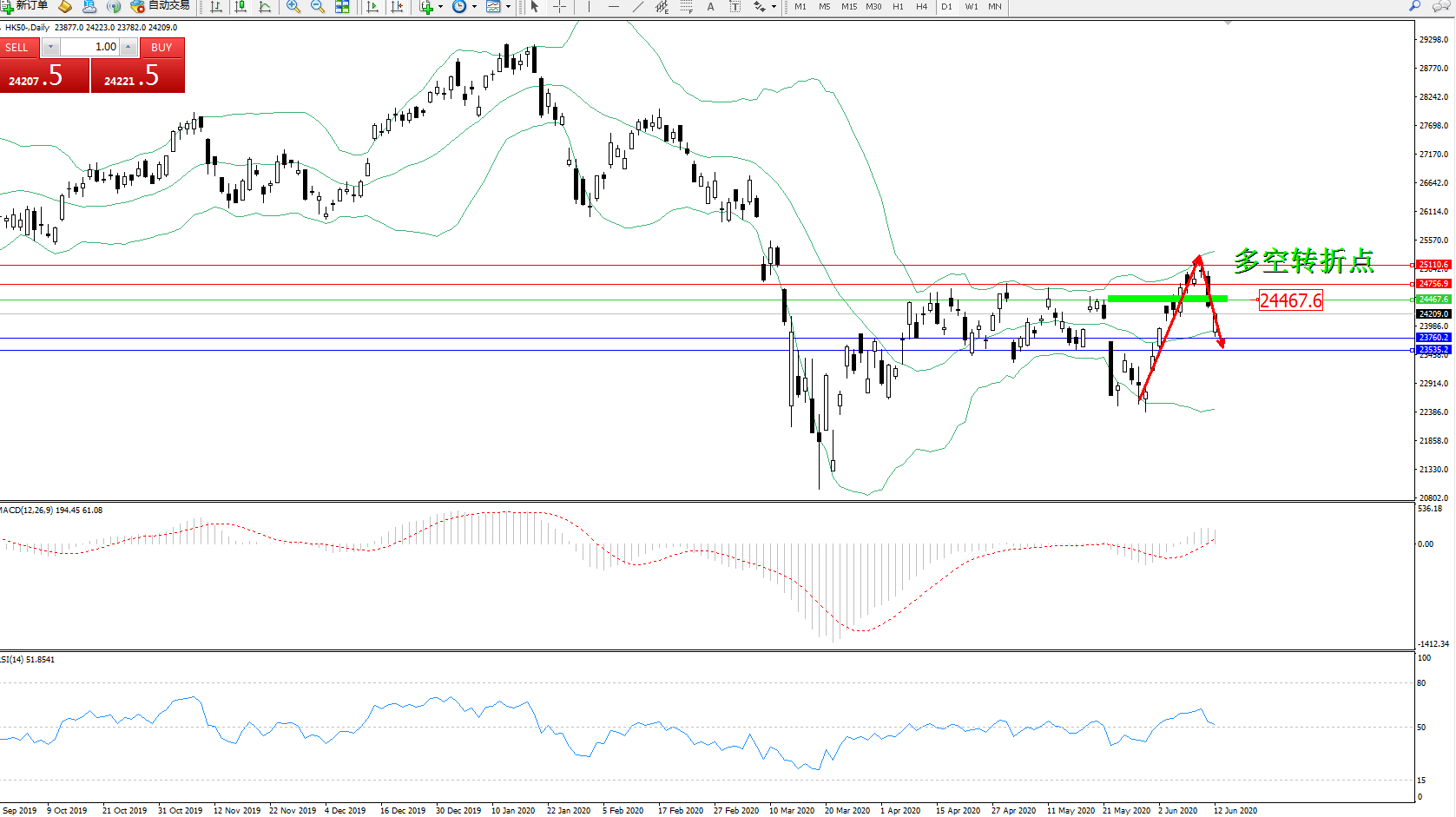 香港恒生指数6月12日(周五)收盘下跌178.77点,跌幅0.73%,报24301.38点;港股三大指数均收跌,恒指尾盘跌幅明显收窄,南下资金逆势净流入30.15亿港元,大市成交额为1154.38亿港元。盘面上,市场担忧美国可能出现第二波疫情,生物制药股与医疗设备股逆势领涨,亚盛医药飙涨17%,威高股份升超4%再创新高;美股创下12周来最大跌幅。本质上来说,这次的下跌就是因为涨幅过大引起的,领头羊纳指从底部上来也超过了40%,中间也有过几次下跌,美联储大力放水是关键因素,而昨日美联储的表态看上去也没有新招,总体市场对于放水这块的刺激在边际递减。