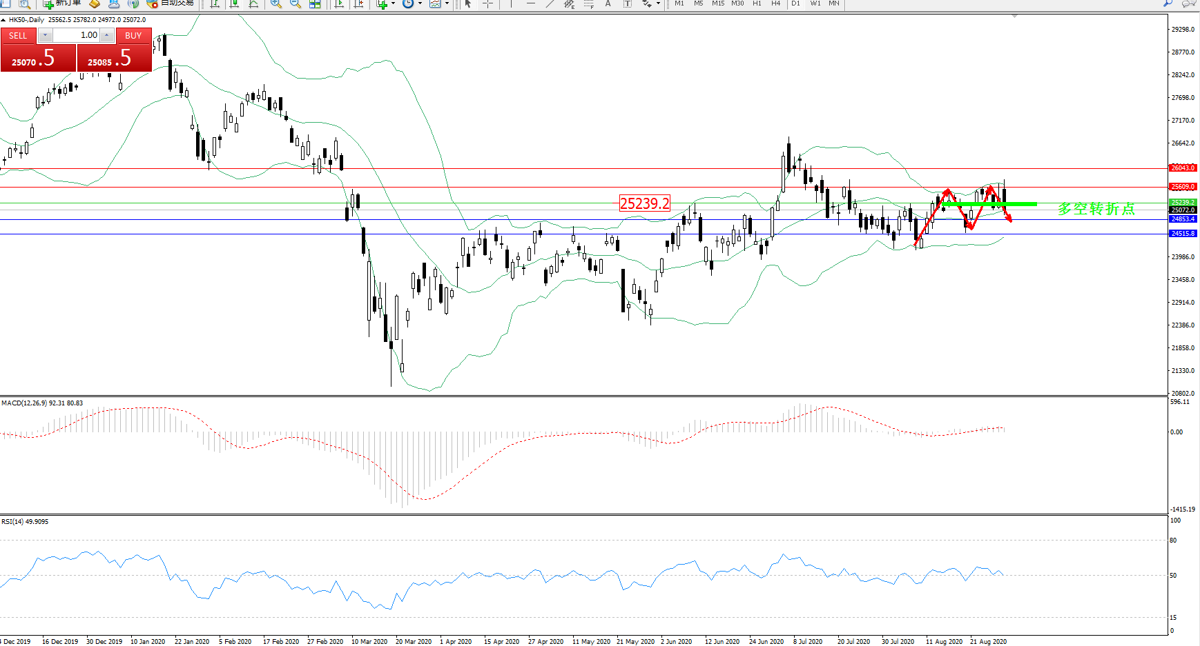 香港恒生指数8月31日(周一)收盘下跌245.01点,跌幅0.96%,报25177.05点;港股三大指数均呈高走低走行情,尾盘跌幅进一步扩大。恒生科技股跌多涨少,美团跌3.6%,中芯国际3.3%,腾讯跌近2%;小米逆势升4.4%创新高,阿里涨2%盘中再次破顶。今日南下资金净流入55.89亿港元,大市成交额为1817亿港元。港股8月收官,恒指月涨2.37%,国指月跌0.48%。上周五盘中创出历史新高价56.94美元的百胜中国(YUMC.US)今日盘前涨5.29%报59.49美元,开盘势将再创历史新高。百胜中国港股明天(9月1日)起招股,估值近2000亿,周五(9月4日)截止认购,预计9月4日定价,股份预期于9月10日上市。香港特区政府今日公布本财政年度首四个月(即截至今年7月31日)的财务状况。本财政年度首四个月的整体开支为2898亿港元,收入为1061亿港元,因此有1837亿港元的赤字。