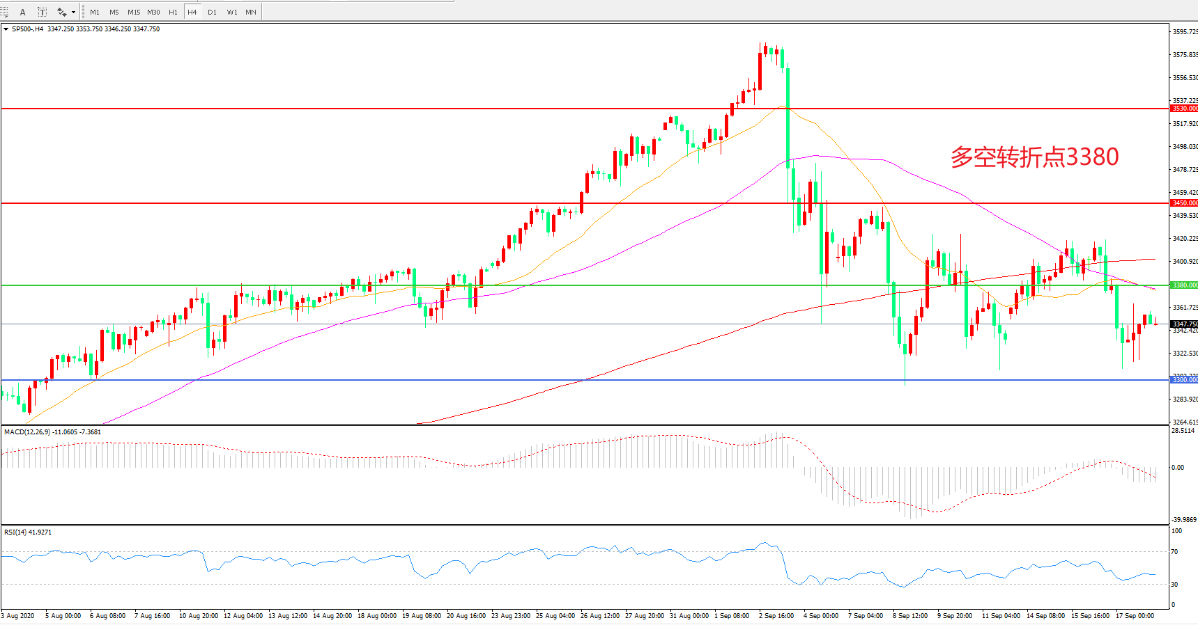 4小时图看,标普500冲高回落,显示上方抛压严重,均线系统走平,形成短期阻力, MACD红柱缩短,RSI指标走平,日内延续震荡概率较大。