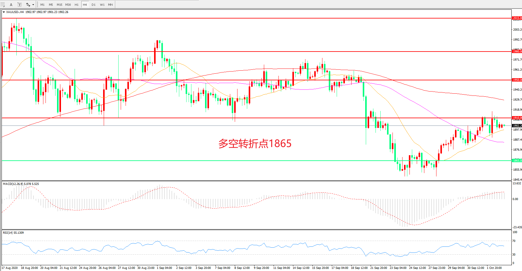 上周,超级“黑天鹅”突袭市场,特朗普宣布确诊新冠后,美股、原油跌超2%,黄金一度上涨至1910美元/盎司后小幅回落,收报1903.33美元/盎司。眼下正值美国总统大选的关键时期,特朗普确诊及选情的混乱会令美元资产可能失去部分吸引力,这对于黄金是明显的利多,从当前的情况观察,市场将在不确定性的风暴中不停摇摆。