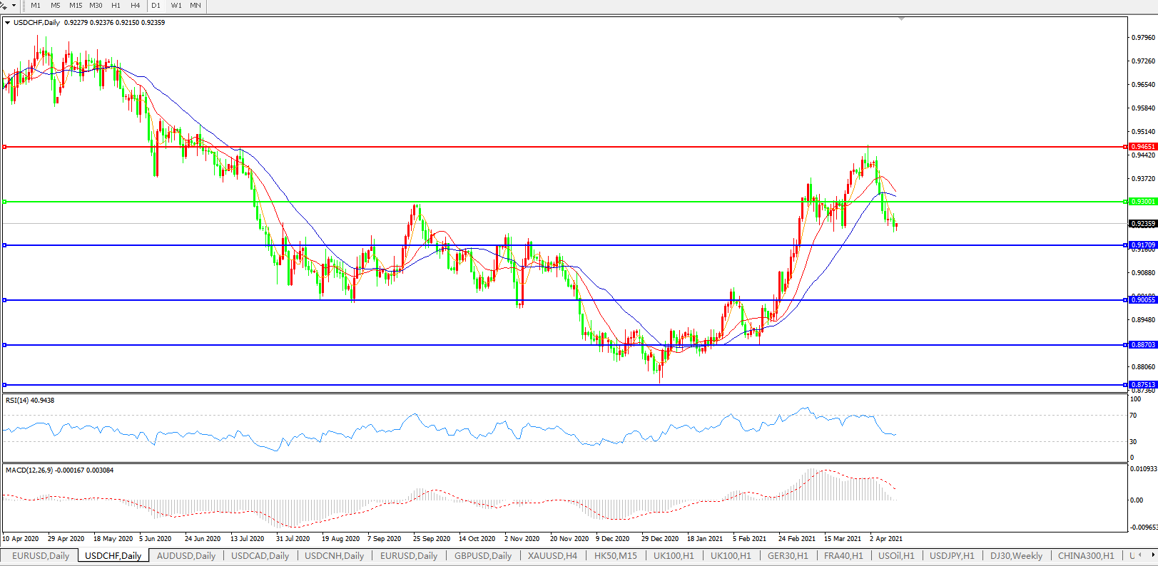 交易策略:0.9300下方看跌,目标0.9170、0.9000