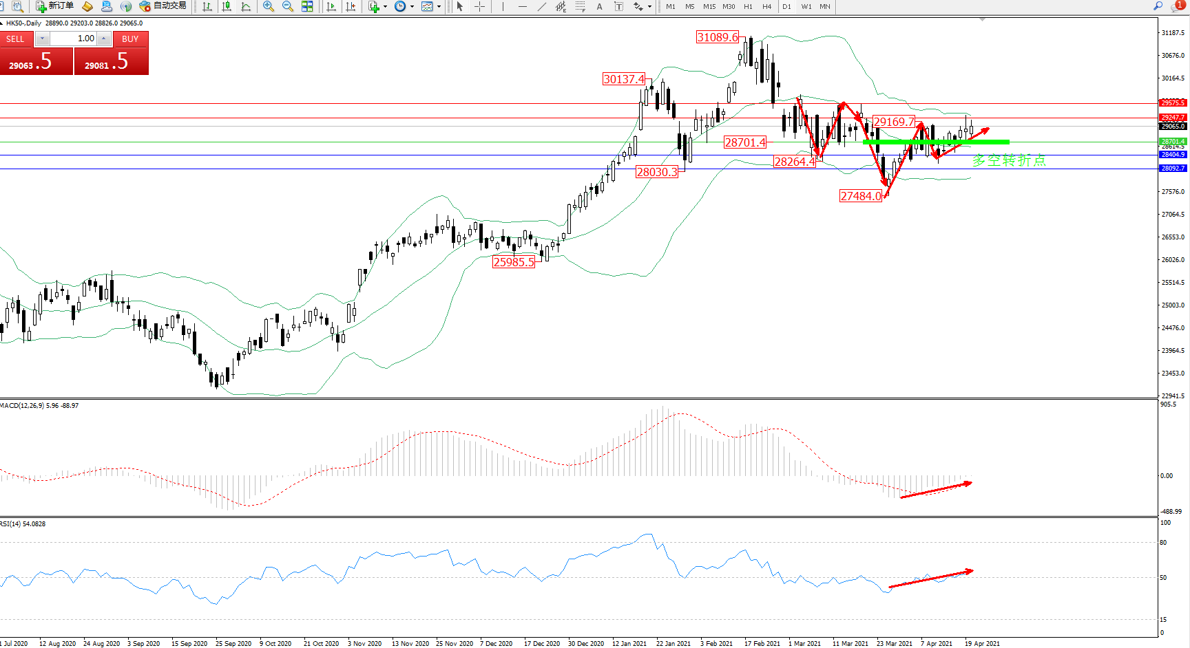 技术点评:空头动力延续布林带指标通道中下轨区间持续下行后,低位抵达27484附近得到支撑反转上移,纠结于布林带指标中轨附近持续震荡后有上移迹象,布林带指标呈收口走势后开始平移,关注中轨附近节点,MACD指标处于0轴线下方空头区域维持整理缓慢上移,RSI指标处于50均衡线附近弱势徘徊中;