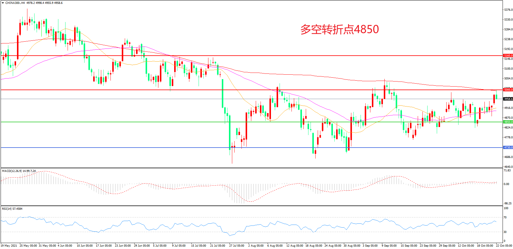 4小时图看,沪深300以55均线为依托震荡反弹,5000点成为上方阻力,4850成为下方支撑,MACD红柱缩短,RSI指标走平,重点关注200周期均线附近的表现。