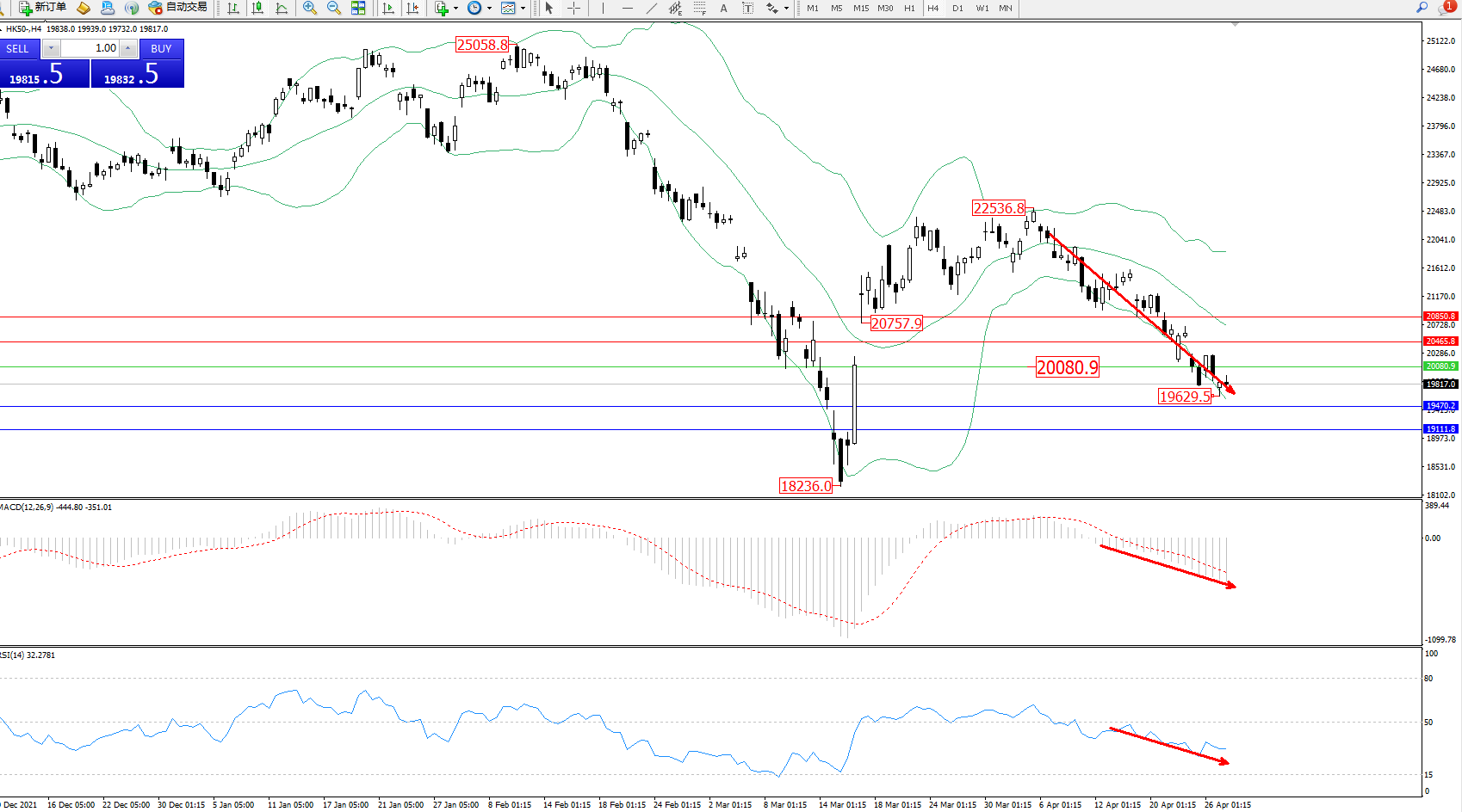 技术点评:空头动力延续布林带指标通道中下轨区间持续震荡下挫,低位抵达19629附近节点开始震荡,短期弱势下行走势延续,布林带指标呈缓慢张口不断向下移动,MACD指标处于空头区域维持震荡向下移动,RSI指标处于空头区域维持弱势下移中;