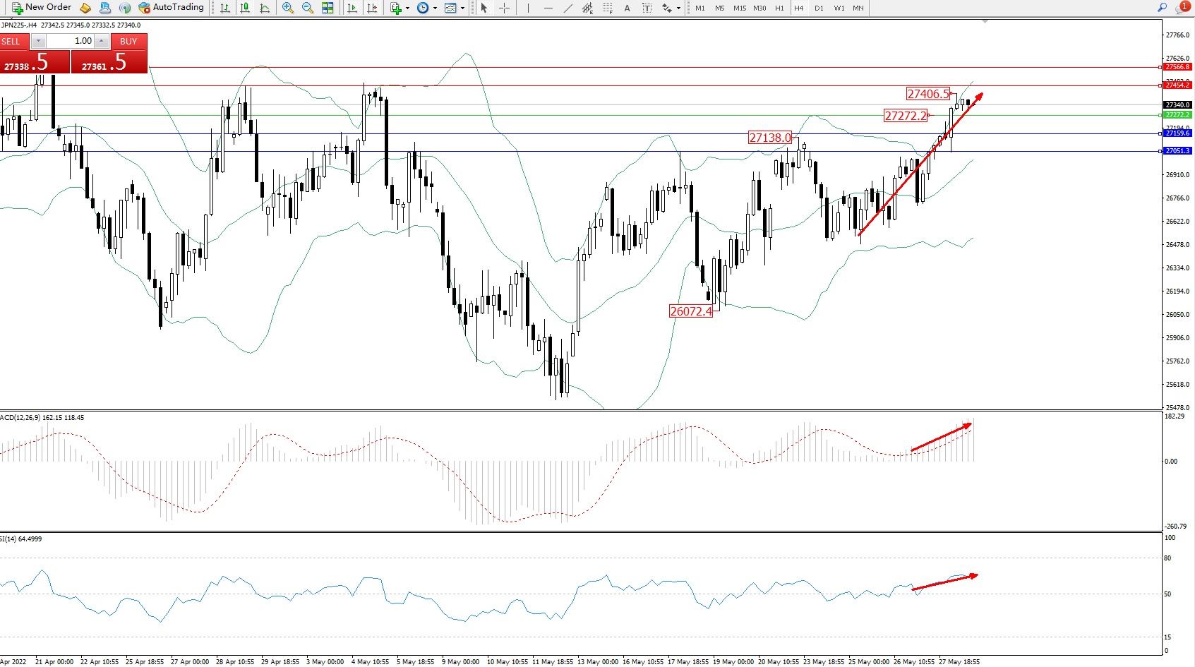 日经225指数5月30日(周一)收盘上涨592.82点,涨幅2.21%,报27374.50点。据路透调查:28位经济学家中约70%预计本季度日本经济将恢复到2019年底疫情爆发前的水平。预计日本2022财年GDP增长2.3%,2023财年增长1.5%(4月份预期分别为2.5%和1.6%)。