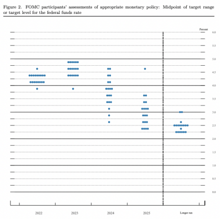 具体来看,本次除一人外,其他所有18名联储官员都预计今年政策利率联邦基金利率将升至4.0%以上,其中9人预计在4.25%到4.5%区间。