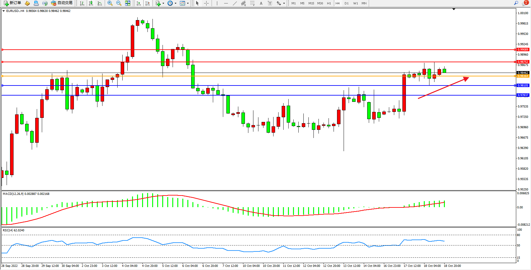 交易策略:0.98364上方看涨,目标0.98752、0.99089