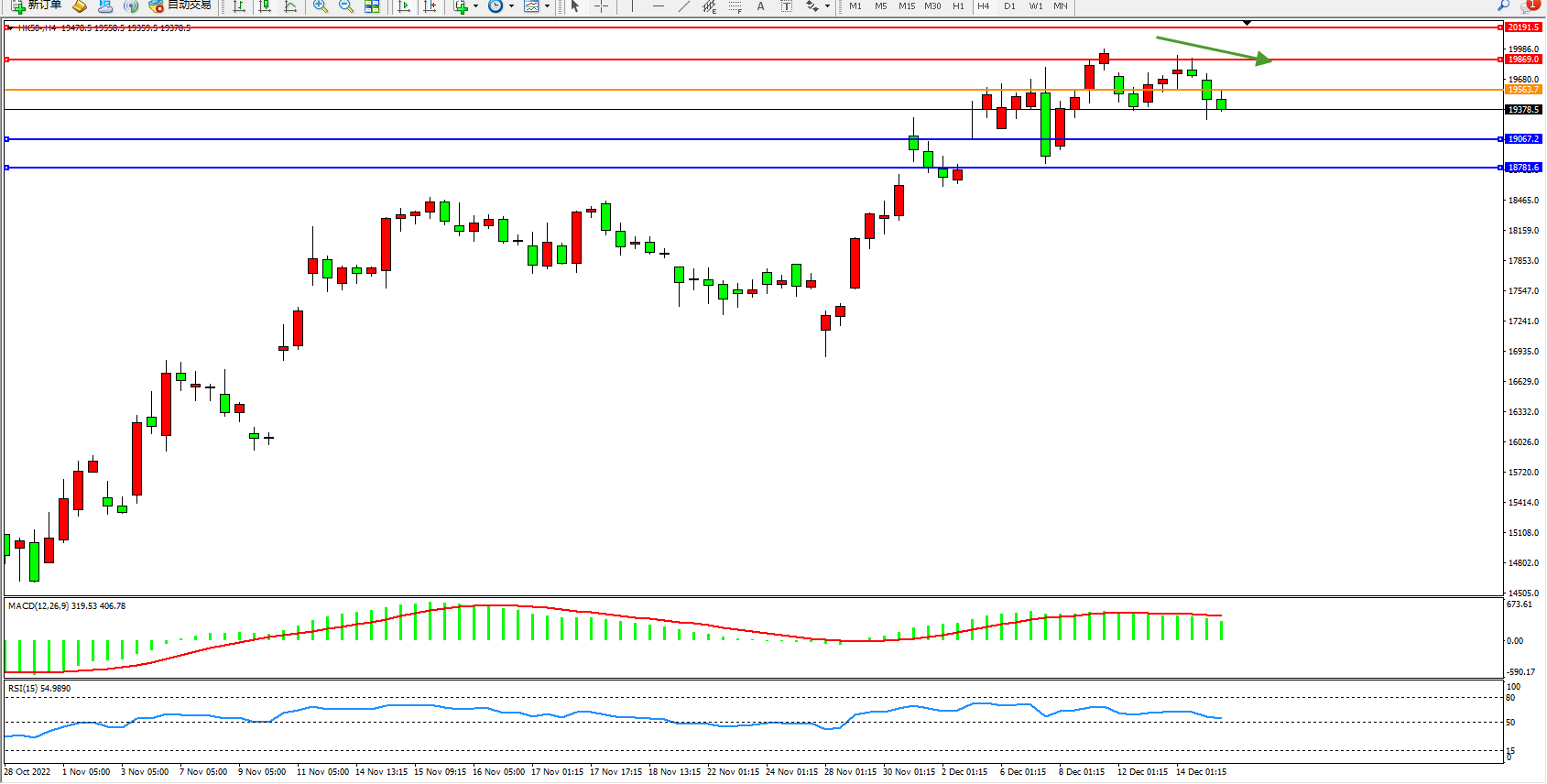4小时图看:高位短期整理,市场空头情绪有伺机入场迹象,MACD指标处于多头区域高位整理,RSI指标处于50均衡线上側徘徊;