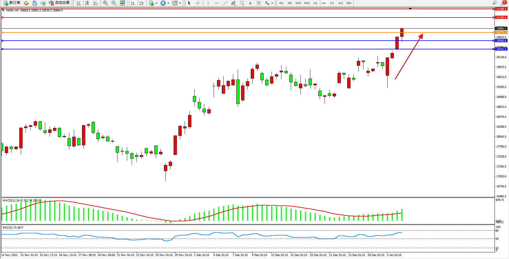 香港恒生指数1月4日(周三)收盘上涨647.82点,涨幅3.22%,报20793.11点;港股2023年第二日交易日走强明显,三大指数皆呈高开高走行情,恒指涨3.22%上扬647点,国指涨3.39%,恒生科技指数更是大涨4.58%,三者皆刷新阶段新高。大型科技股全线上涨带领大市走俏,阿里巴巴涨约9%,百度涨超8%,南下资金净流入71.17亿港元,大市成交额为1496亿港元。