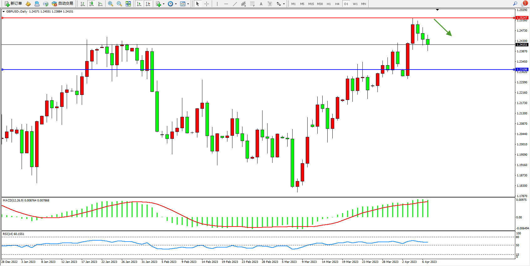 多头动力持续拉升上扬,高位短期遇阻回撤,市场空头情绪不断涌现,上方压制关注1.25247附近,低位支撑关注1.23106附近,MACD指标处于多头区域持续上移,RSI指标处于多头区域整理,如图: