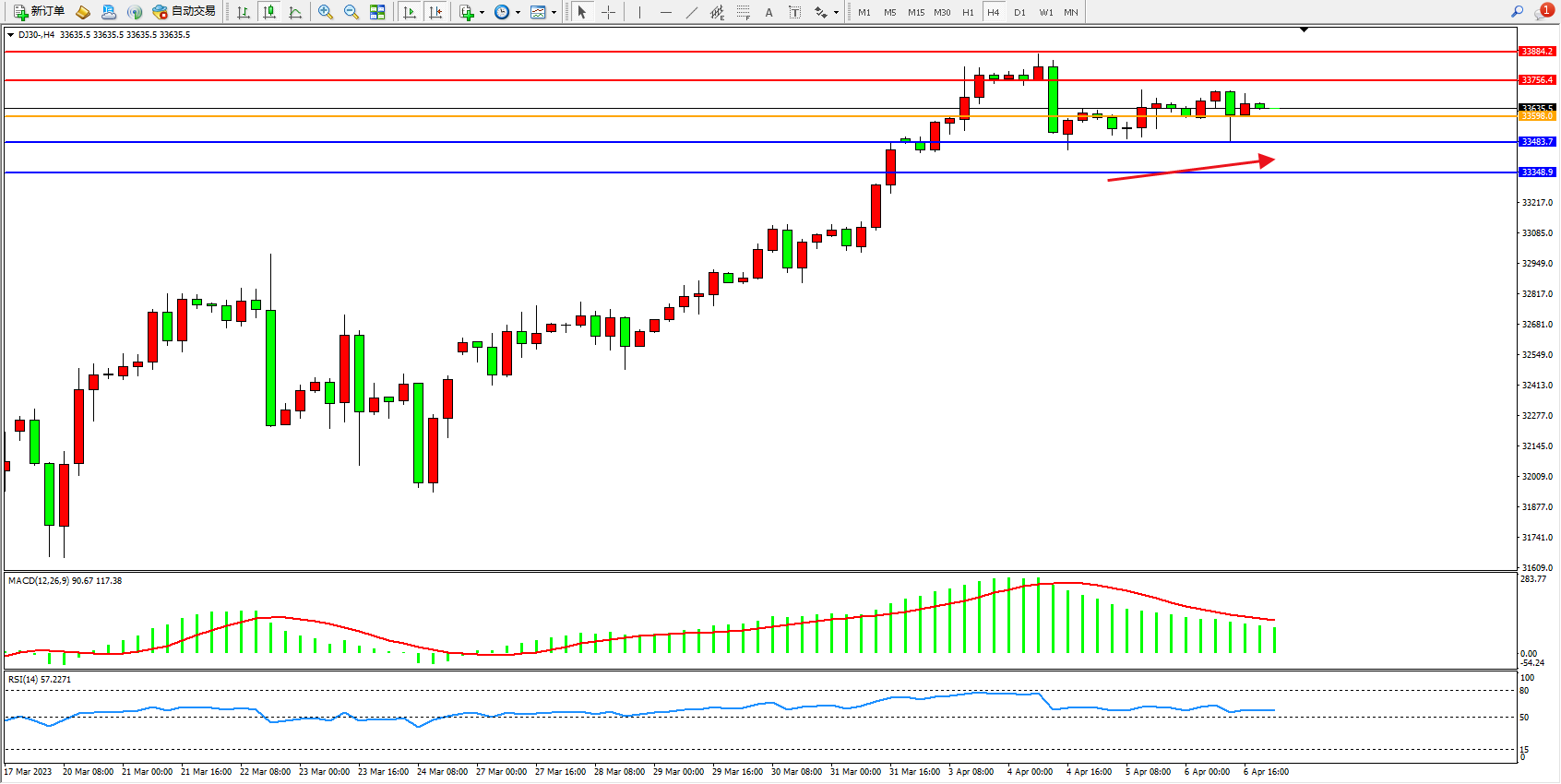 道琼斯指数4月6日(周四)收盘上涨2.63点,涨幅0.01%,报33485.35点;美国3月失业率 3.5%,预期3.60%,前值3.60%。美国3月季调后非农就业人口 23.6万人,预期23.9万人,前值31.1万人。
