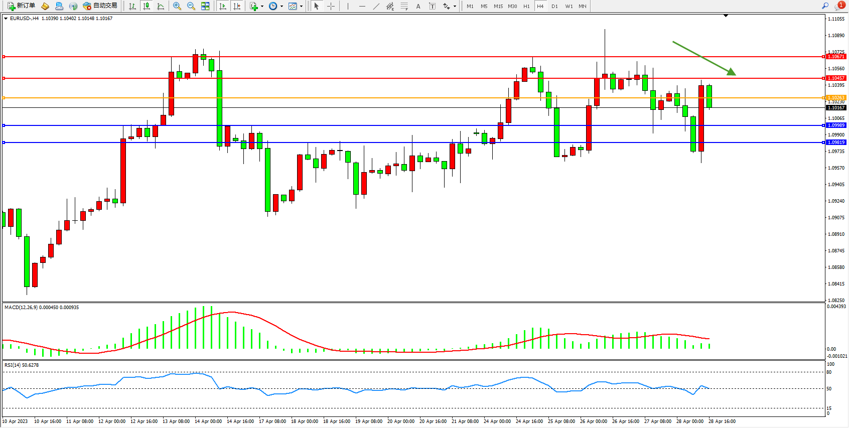 欧元美元EURUSD—4小时K线图显示: