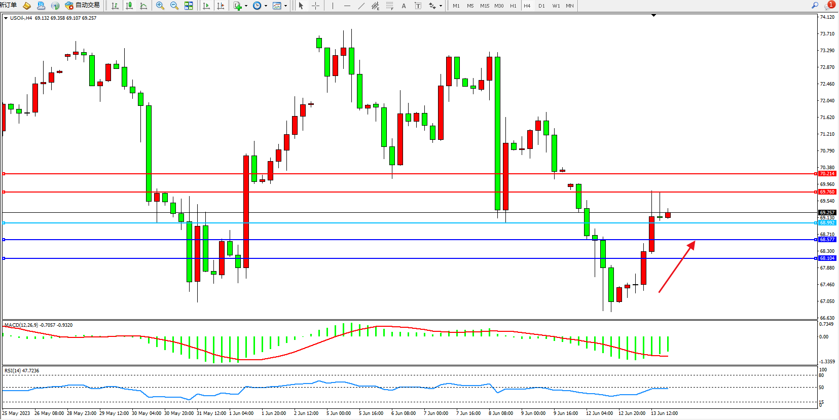 原油维持69.257附近震荡,OPEC月报:预计下个月全球原油每日消费量将比供应量高出约270万桶。如果沙特选择将减产延长至整个第三季度,供应缺口将创2021年以来最大。