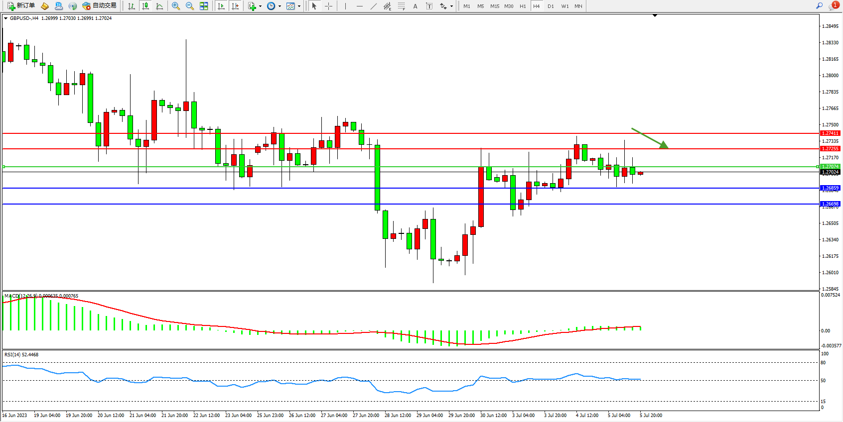 交易策略:1.27074下方看跌,目标1.26859 1.26698